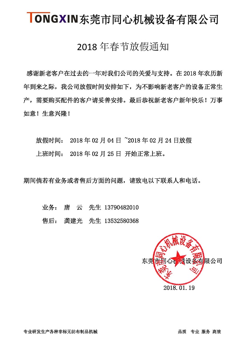 感謝新老客戶在過去的一年對我們公司的關愛與支持。在2018年農(nóng)歷新年到來之際,我公司放假時間安排如下,為不影響新老客戶的設備正常生產(chǎn),需要購買配件的客戶請妥善安排。最后恭祝新老客戶新年快樂!萬事如意!生意興隆!