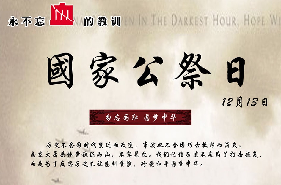 1937年12月13日,侵華日軍野蠻侵入南京,制造了慘絕人寰的南京大屠殺慘案,30萬同胞慘遭殺戮,無數(shù)婦女遭到蹂躪殘害,無數(shù)兒童死于非命,三分之一建筑遭到毀壞,大量財物遭到掠奪。侵華日軍一手制造的這一滅絕人性的大屠殺慘案,是第二次世界大戰(zhàn)史上“三大慘案”之一,是駭人聽聞的反人類罪行,是人類歷史上十分黑暗的一頁。