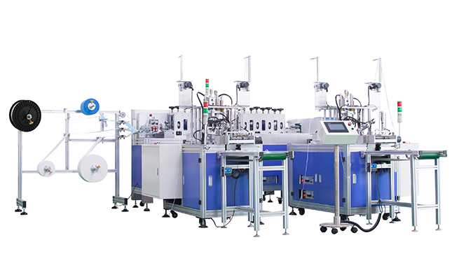 該套設(shè)備組成由:口罩本體機(jī)+輸送分配機(jī)+2臺(tái)頭掛口罩機(jī)組成。