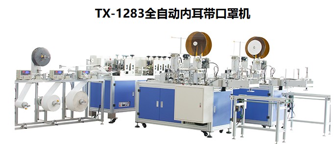 該套設(shè)備組成由:口罩本體機+.翻片機構(gòu)+.輸送分配機+2臺內(nèi)耳帶機 組成。